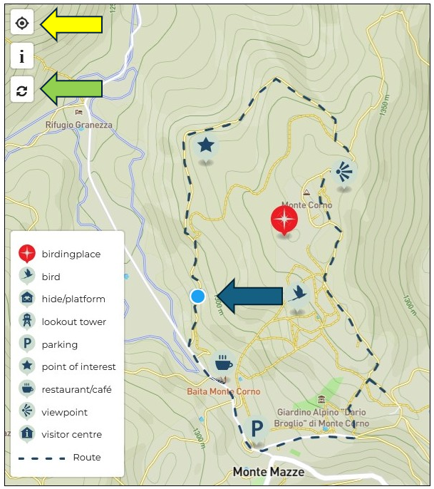 Passaggio 2: Fai clic sull'icona della posizione nell'angolo in alto a sinistra della mappa (vedi la freccia gialla sulla mappa). Un punto blu apparirà sulla mappa indicante la tua posizione (vedi la freccia blu sulla mappa). Il punto blu mostra dove ti trovi in quel momento e segue la tua posizione, consentendoti di vedere in che direzione stai andando.