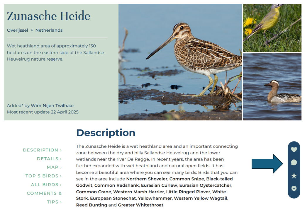 Naast elke beschreven gebied vind je dit kleine menu (zie de blauwe pijl hierboven) zwevend aan de rechterkant van je scherm op laptop, tablet of pc, of onderaan het scherm van je telefoon. Klik op het tekstballonpictogram onder het hartje. Je krijgt dan een pop-up met 2 opties. OPTIE 1: Een reactie, tip of vogelwaarneming plaatsen. Je reactie is na plaatsing direct zichtbaar onderaan de pagina. OPTIE 2 is voor meer gedetailleerde en inhoudelijke feedback. Hier kun je suggesties doen voor aanpassingen in de tekst, kaart of vogellijst. Deze feedback wordt dan vervolgens doorgestuurd naar de redactie van Birdingplaces en de auteur van het gebied.